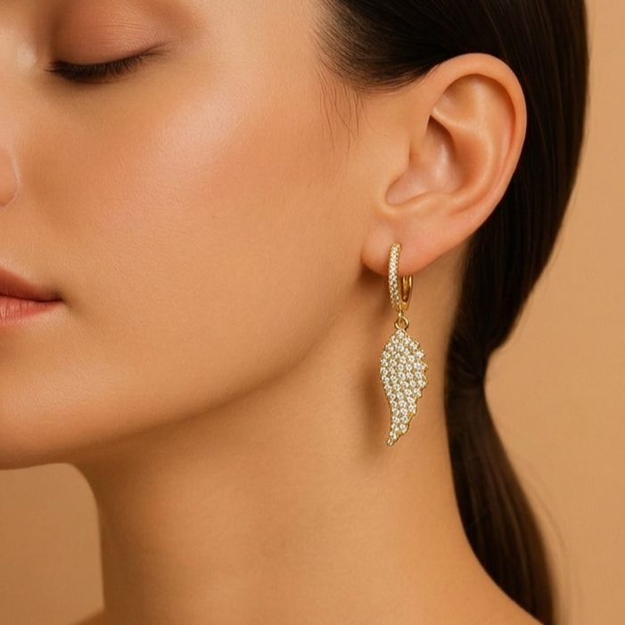 Angel Wings Huggies Earrings by Arvino are designed to symbolize grace and freedom. Crafted from pure 925 sterling silver, these hoops are finished with luxurious 22kt real gold plating for a soft, radiant glow. The delicate angel wing detailing adds a meaningful and elegant touch to the design. Lightweight and comfortable, these earrings are perfect for everyday wear while still making a subtle statement. A timeless piece that blends symbolism with modern style.