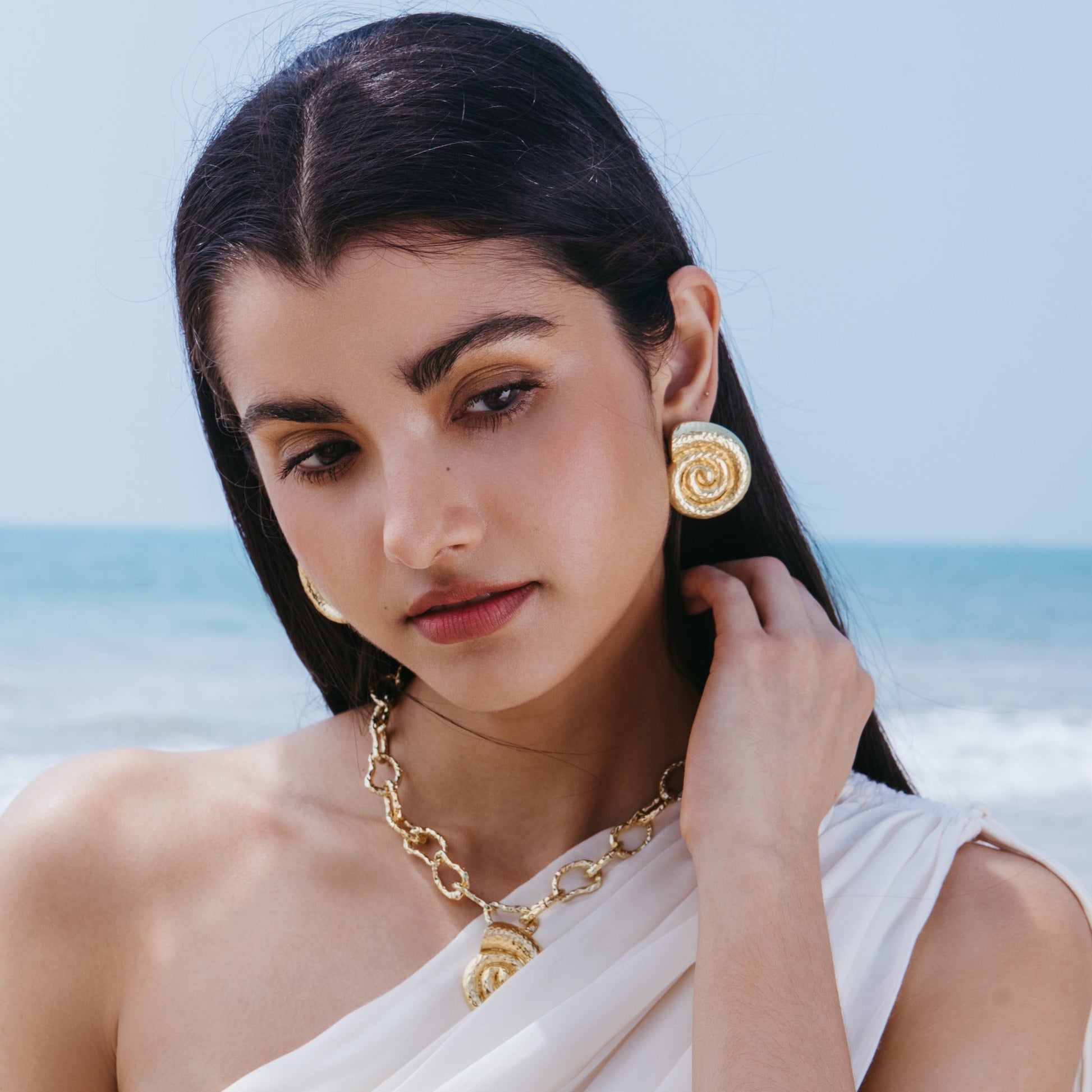 Our Coral Shell Studs are a treasure trove of intricate textures, mirroring the rugged yet elegant surface of coral reefs. Each stud is adorned with delicate ridges and patterns, resembling the mesmerizing intricacies of underwater life. These studs evoke the sensation of diving into the depths of the sea, where every detail tells a story of resilience and grace.