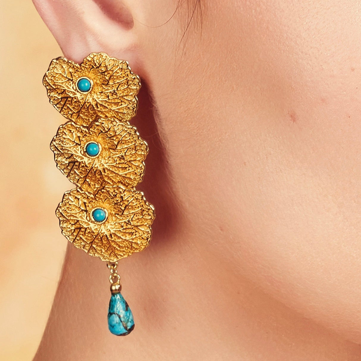 Inspired by blooming marigolds, these studs feature stacked floral discs with a turquoise drop, symbolizing desert flowers under blue skies. Finished in 22KT dull gold matte plating, their textured bronze base highlights folk vibrance.