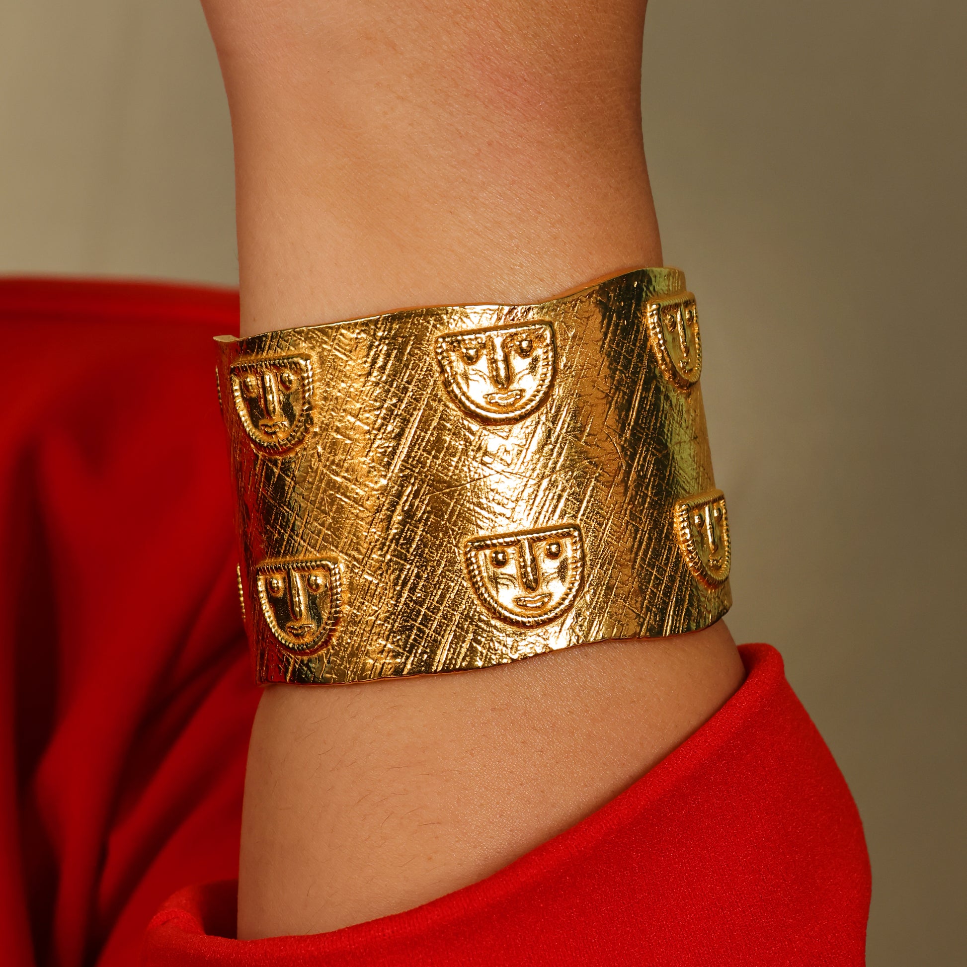 Inspired by the architectural charm of Jharokhas—ornate palace windows of Rajasthan—this cuff celebrates heritage and royal design. Its intricate cutwork mirrors haveli splendor. Finished in 22KT dull gold matte plating over textured bronze, it blends tradition and sophistication, carrying stories of culture and craftsmanship on the wrist with timeless boldness.
