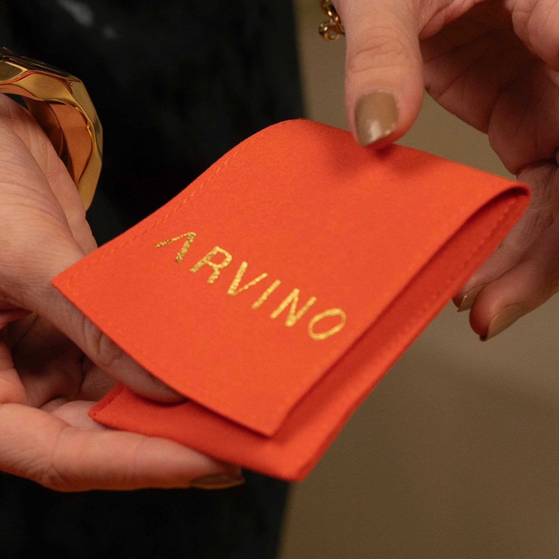 Store your jewelry in the provided Arvino Pouch to prevent tarnishing when not in use. To preserve its plating, avoid contact with cleaning agents, beauty products, chemicals, and sanitizers. Ensure chains are securely fastened during storage to prevent tangling and damage.