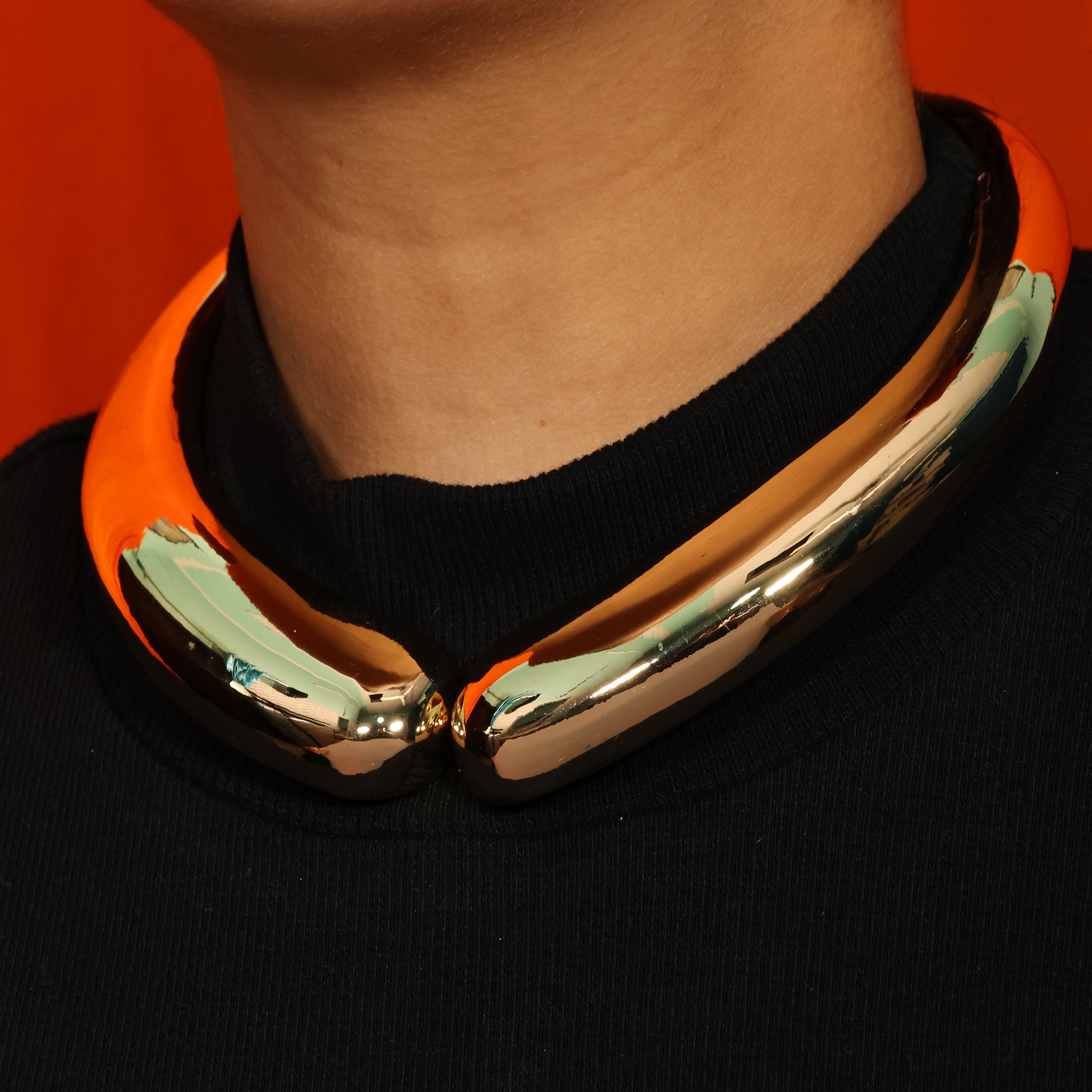 Sculptural and elegant, the Solis Collar in gold is real gold-plated and designed to make a statement. The smooth, polished finish and open-front design make it a standout piece that sits comfortably on the collarbone. Long-lasting and eye-catching, it brings luxury to every look.