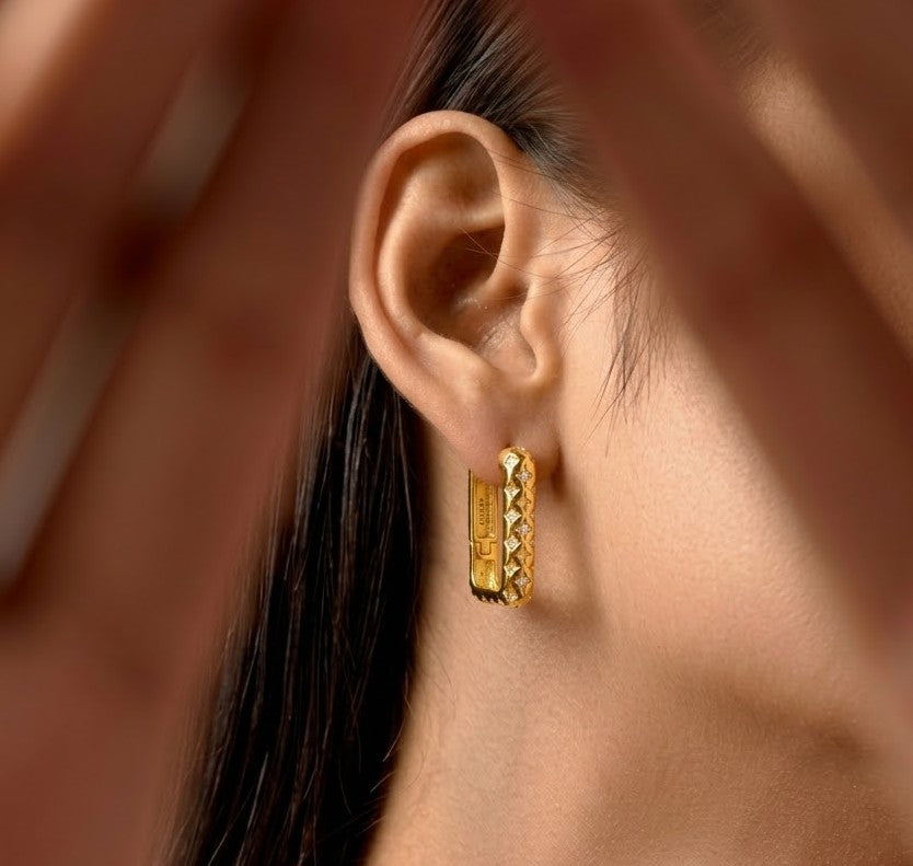 The Starstruck Huggies Medium boast a stylish rectangular shape, featuring embossed stars with select stars adorned with dazzling CZ stones. This design offers a striking balance between boldness and sophistication, perfect for adding a touch of celestial charm to both casual and formal looks. Their unique design and added sparkle make them a standout accessory for those who love to shine.