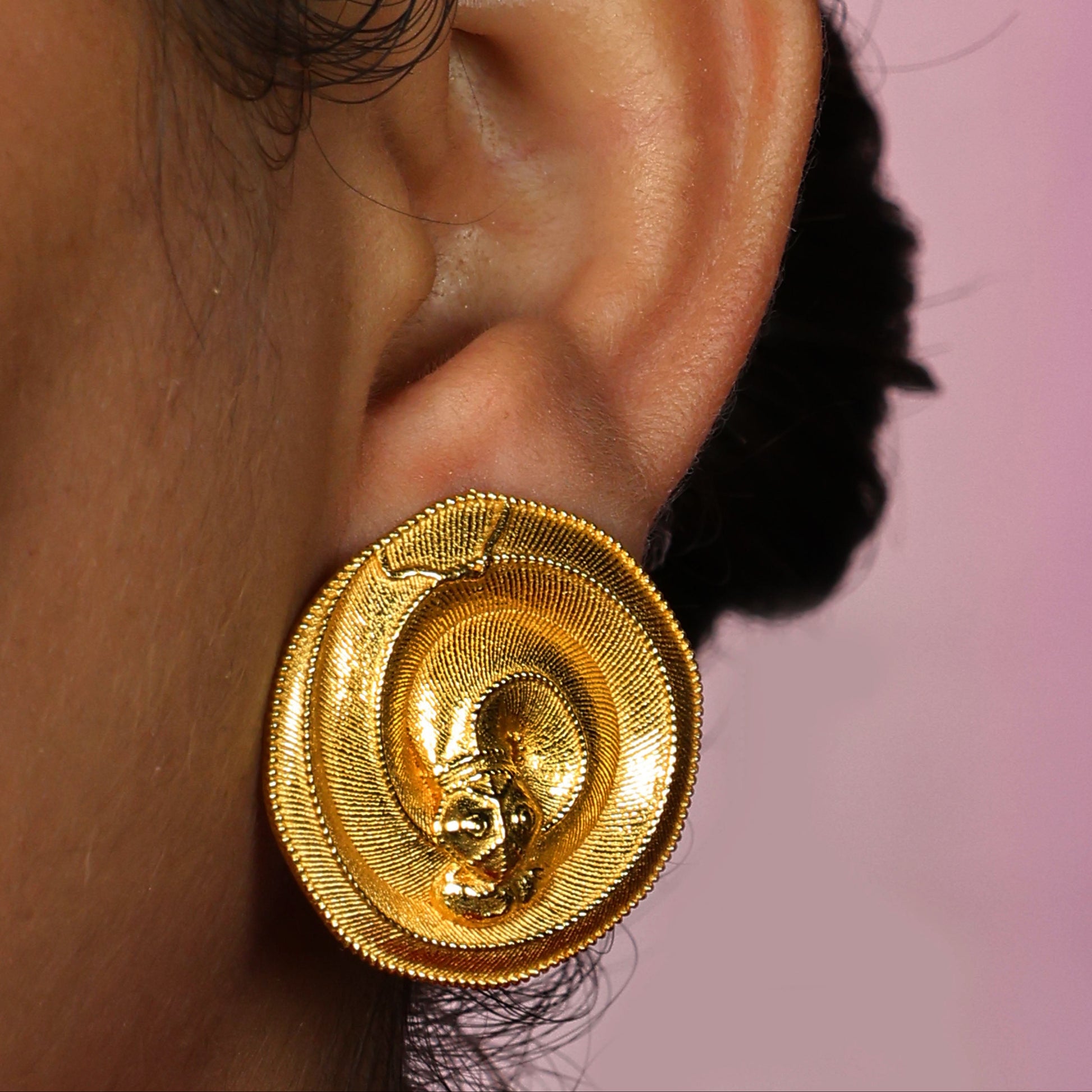 Inspired by the Surya (sun), these spiral studs radiate celestial energy. Their swirling design symbolizes light and cosmic rhythm. Finished in 22KT dull gold matte plating, they shine with heritage while maintaining a subtle matte charm.