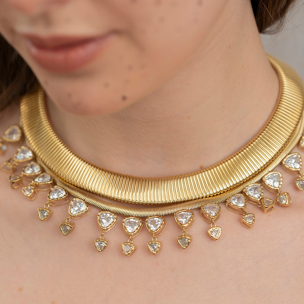 Elevate your elegance with The Illuminati Necklace, a masterpiece of modern design. This exquisite necklace features a series of meticulously cut triangular cubic zirconia stones, each suspended in a captivating arrangement along a sleek, flat chain. The geometric precision of the triangular stones contrasts beautifully with the smooth, minimalist chain, creating a striking visual harmony. As the stones catch the light, they produce a scintillating sparkle that enhances your look with radiant sophistication. The adjustable chain ensures a custom fit, making it versatile enough for both glamorous evenings and stylish daytime ensembles. The Illuminati Necklace is the perfect fusion of bold design and refined elegance.
