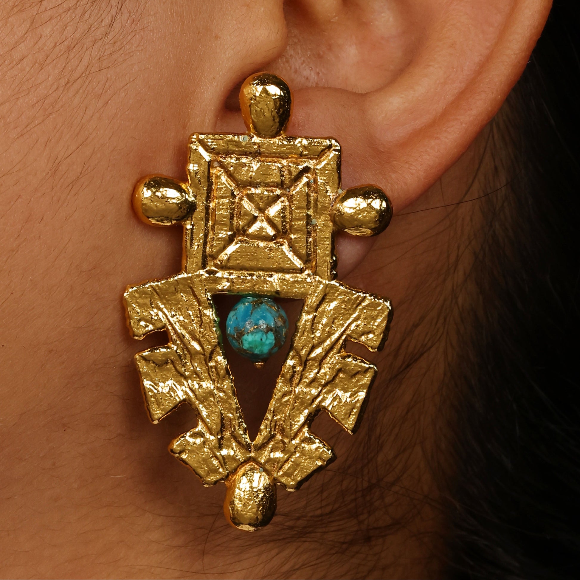 Inspired by protective shields, these earrings symbolize courage with turquoise accents. Their design celebrates resilience. With 22KT dull gold matte plating, the textured surface adds regal character.