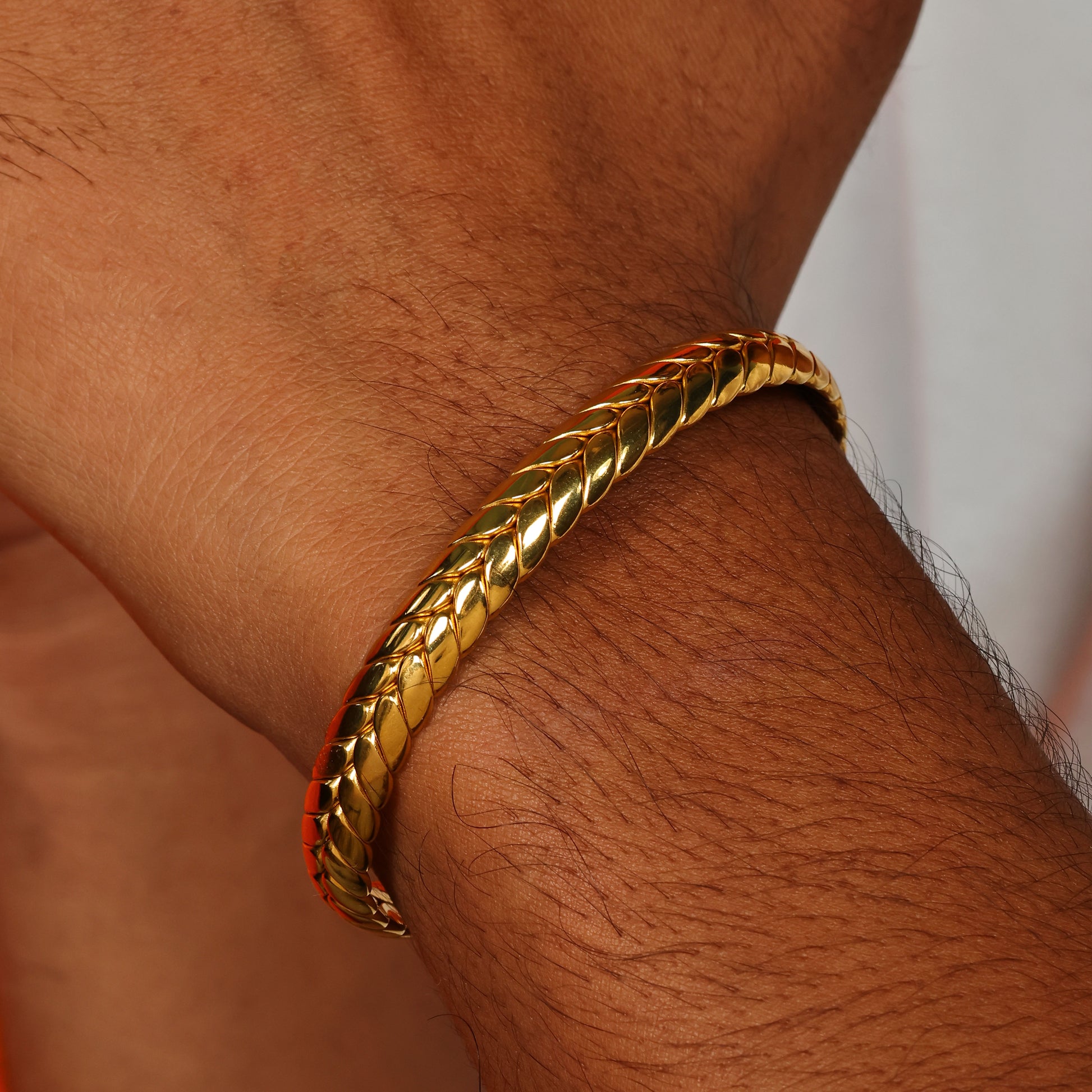 Twist Sankalp Cuff is finished in 22kt dull gold plating with a twisted rope texture. It symbolizes resolve and strength, making it a subtle yet powerful statement for him.